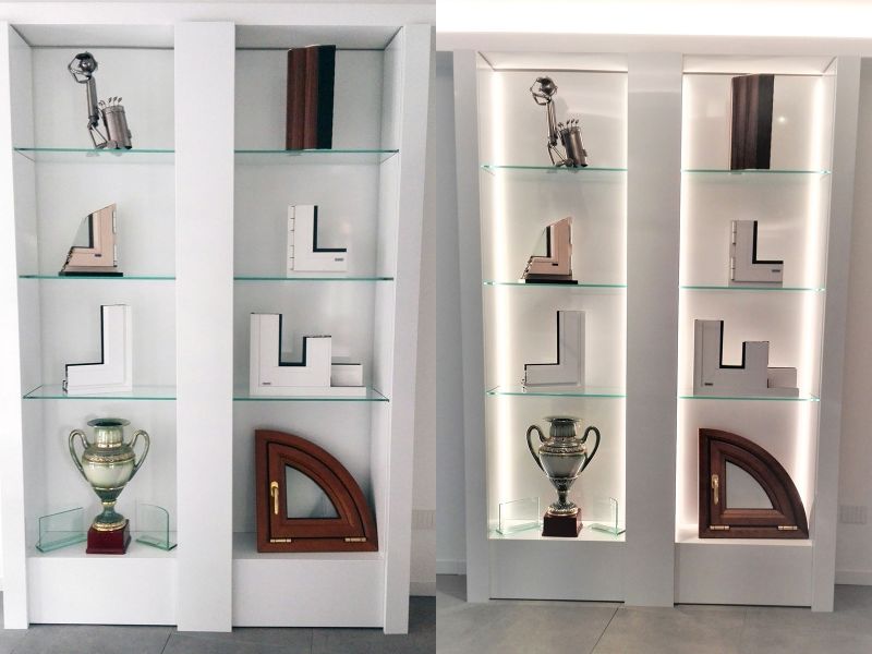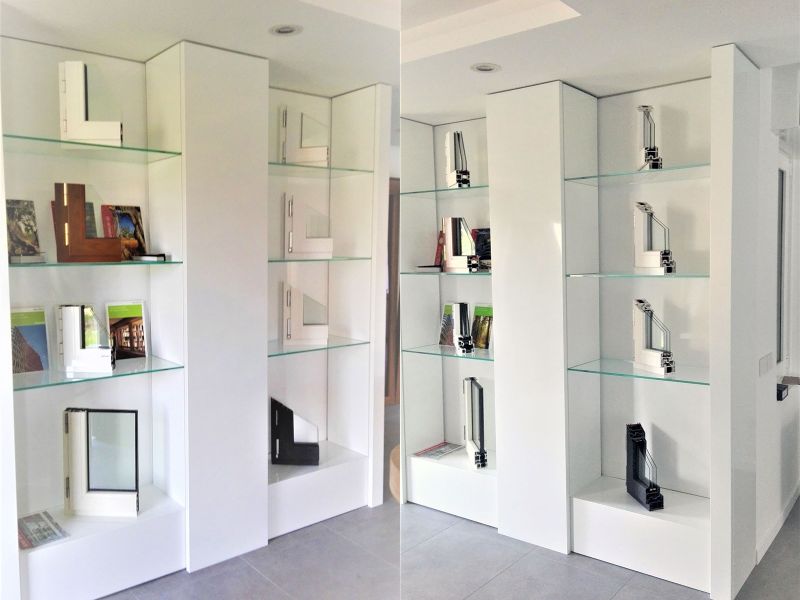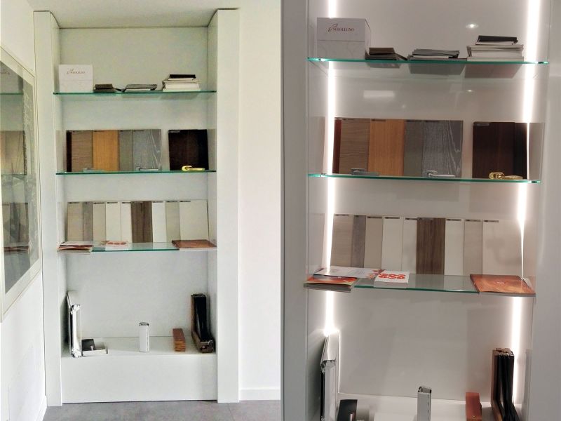 Possiamo fornire espositori e scaffalature in lamiera di alluminio colorata, piegata e curvata a campione, con mensole in vetro o alluminio.